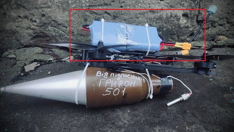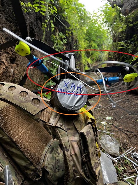 Unlike the pressure-sensitive nose on RPGs, homemade anti-personnel bombs do not come pre-made with a trigger and fuse. These too need to be made and prepared by drone teams on the frontline. Often, this trigger is the only part of the drone that observers actually see on video.